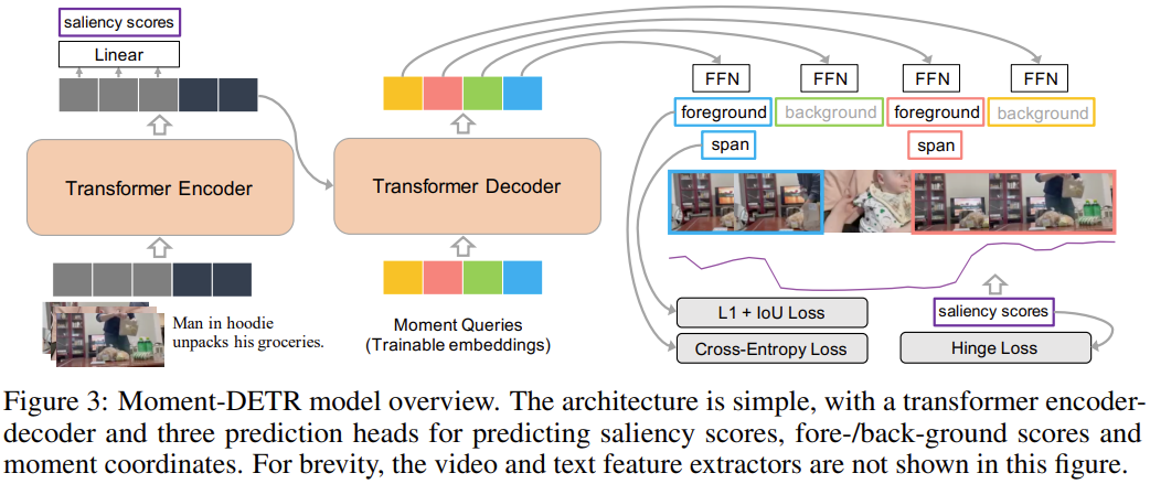 Prediction heads. 인코더 출력 $E_{enc}$를 linear layer에 입력하여 saliency score $S\in\mathbb R^{L_v}$를 얻고, 디코더의 출력 $E_{dec}$를 3-layer FFN with ReLU에 입력하여 입력 영상에 대한 normalized moment center coordinate를 얻습니다. 또한 DETR과 같은 방식으로 linear layer with softmax를 이용해 class label을 예측하는데, object retrieval task가 아닌 temporal grounding task이므로 라벨은 foreground와 background가 됩니다.