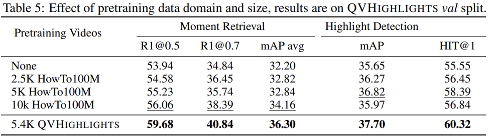 Pretraining data domain and size. 사전학습의 역할을 정확히 파악하기 위해, 저자들은 사전학습에 사용되는 데이터셋과 그 크기를 바꿔보았습니다. HowTo100M 데이터셋을 이용해 사전학습을 진행한 결과 여전히 성능이 향상되었는데, 사전학습에 사용되는 영상의 크기가 증가할수록 moment retrieval 성능도 향상되었습니다. 한편, highlight detection의 경우 데이터의 증가가 성능의 향상으로 직결되지는 않았는데, 이는 사전학습 task가 highlight detection과 직결되지 않기 때문인 것 같습니다. (앞서 언급했듯이, 사전학습에는 saliency loss가 사용되지 않으며 이는 특히 highlight detection과 연관된 loss입니다.) 또한, HowTo100M과 QVHIGHLIGHTS의 도메인 차이로, HowTo100M에서 만개의 데이터를 사용해도 5천4백 개의 QVHIGHLIGHTS 데이터를 사용한 것보다 결과가 좋지 않았습니다.