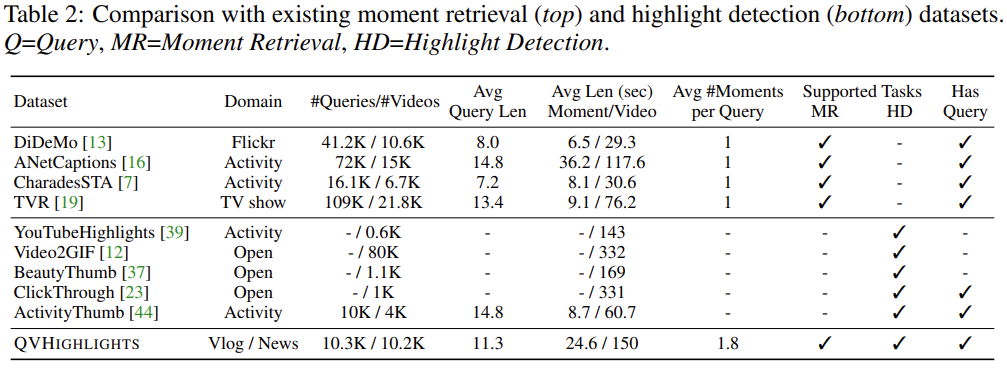 Datasets and Tasks. Moment Retrieval은 동영상 속에서 주어진 자연어 쿼리에 해당하는 영역(moment)의 위치를 찾는 task입니다. 기존의 데이터셋들은 대체로 찾아야 할 영역이 영상의 시작이나 끝 부분에 분포하는 temporal bias문제가 심각한 문제가 있었으나, 저자들이 제안하는 QVHIGHLIGHTS 데이터셋은 영상의 전 구간에 탐색 영역이 분포한다고 합니다. 또한 기존 데이터셋들에는 영상 하나에 탐색 영역이 단 하나 존재했던 반면, 제안하는 데이터셋에서는 하나의 영상 내부에 탐색 영역이 하나 이상 존재합니다.