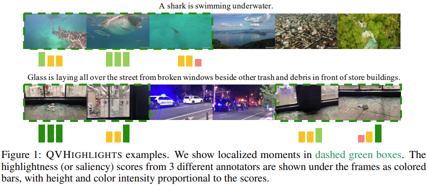 - 만 개의 영상과 사람이 입력한 자연어 쿼리, relavant moemnt, saliency score로 구성된 QVHIGHLIGHTS 데이터셋 제작