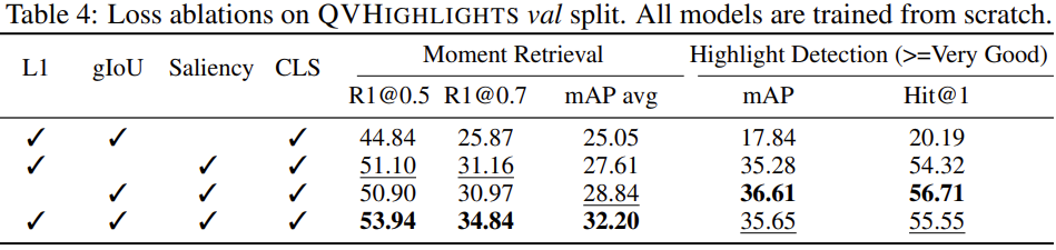 L1과 CLS loss를 제거할 경우 moment retrieval 성능은 하락하였지만, highlight detection 성능은 크게 변화하지 않아 이러한 loss들이 moment retrieval에 중요함을 알 수 있습니다.