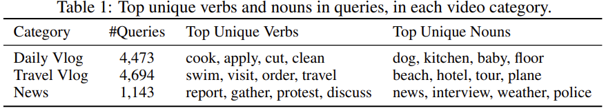 최종적으로 10,310개의 쿼리와 18,367개의 moment, daily vlog, travel vlog, news events 세 가지 부류의 영상 10,148개가 수집되었습니다. 표 1을 보면 각 부류의 영상에서 자주 등장한 동사와 명사를 확인할 수 있습니다.