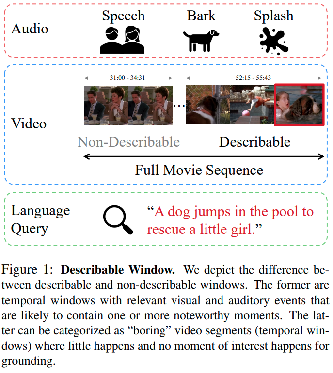그림 1을 보면, 주어진 영상 속에서 쿼리와 연관된 긴 영상 속에 존재하는 두 가지 영역이 예시로 나와있는데요. 첫번째 영역은 "두 사람이 테이블에 앉아있는 장면" 정도로 설명할 수 있는 반면 두 번째 영역은 "여자아이가 물에 빠진다.", "강아지가 문을 연다.", "강아지가 여자아이를 구하기 위해 물에 뛰어든다."와 같이 다양한 문장으로 설명할 수 있습니다. 두 영역이 3분 30초 정도의 비슷한 길이임에도 불구하고, 두 번째 영역이 검색의 결과가 될 만한, notable moment를 더 많이 가지고 있음을 알 수 있습니다. 저자들은 이러한 관측을 기반으로 검색 대상인 영상 속 작은 영역 중, 시각적으로 자연어 쿼리와 유사하거나, 주목할만한(remarkable) 영역을 포함할 확률이 높은 영역을 의미하는 describable windows라는 개념을 도입합니다. 반대로 시각적으로 풍부하지 않은 영역들은 non-describable windows로 정의합니다.