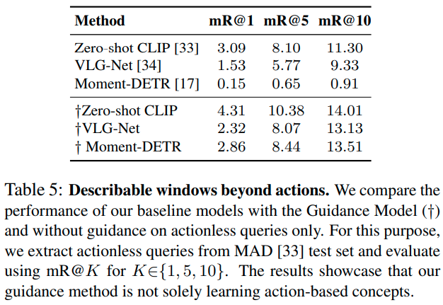 Describable windows beyond actions. 저자들은 MAD 데이터셋에 포함된 쿼리 중 적지 않은 쿼리가 동사가 없거나(10%) 대상의 상태만을 나타내고 있음(18%)을 발견했습니다. 예를 들어, "늦은 시간, 누군가의 빌딩"이나, "잠시 후, 원형 계단에서"와 같은 식으로 말이죠. 따라서 action classifier 등을 활용해 proposal을 생성하는 것이 적절하지 않을 수 있다는 것을 직감한 저자들은 본 연구를 수행하게 된 것인데요. 이 가설을 검증하기 위해, 위 표 5. 에 나타난 것처럼, action이 없는 쿼리들에 대하여 Guidance Model 유무에 따른 성능 차이를 비교해 보았을 때, action이 없는 영역에 대한 성능이 확실히 증가함을 알 수 있었습니다.