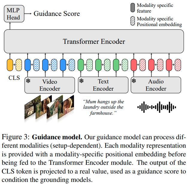 Guidance Model은 query-dependent와 query-agnostic 두 가지 버전이 존재하는데, Query-dependent는 쿼리 텍스트를 포함하여 $E_{in}=|E_{cls}, E_v, E_a, E_t|\in\mathbb R^{(L+1)\times d_g}, L=L_{vg}+L_{ag}+L_{tg}를 입력으로 받고, Query-agnostic은 $E_{in}=|E_{cls}, E_v, E_a|$를 입력으로 받습니다. $E_{cls}$는 학습가능한 cls 토큰입니다.