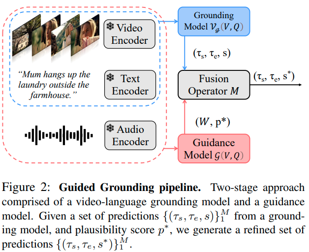 Guidance model $\mathcal g$. Guidance model의 목표는 빈 window에서 생성된 예측들에는 낮은 점수를 부여하고, moments를 포함한 영역 (describable windows)에서 생성된 예측에는 높은 점수를 부여하는 것입니다. $\mathcal g$ 역시 $V, Q$를 입력받고 각 window에 대한 타당성(plausibility) confidence score $p^*$를 출력합니다.