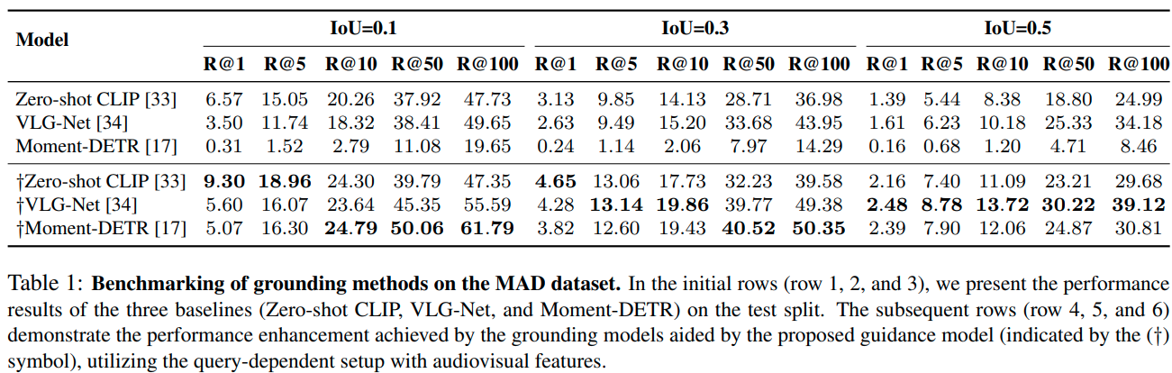 Baselines. MAD 데이터셋에서는 VLG-Net과 zero-shot CLIP, Moment-DETR을 사용하였는데, 앞선 두개는 proposal-based 방법이고 Moment-DETR은 proposal-free 방식입니다. Ego4D에서는 Moment-DETR과 멀티모달 span-based 방법인 VSL-NET을 사용했습니다. 모든 방법론들이 저자들이 제안한 Guidance Model을 적용 시 성능 향상이 일어났다고 합니다.