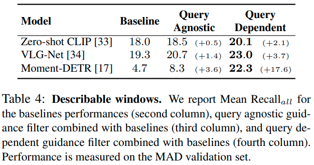 Describable windows. 앞선 실험에서 비디오와 오디오가 모두 강력한 정보를 제공한다는 것을 알았는데요. 앞선 실험에서 사용한 Guidance Model들은 query-dependent 모델로, query가 달라지면 영상 전체에서 describable window를 다시 찾아야 하여 효율적이지 못했습니다. 저자들은 query-agnostic한 Guidance Model을 통해 영상에서 한 번만 describable window를 찾을 수 있을지 시험해 보았습니다.