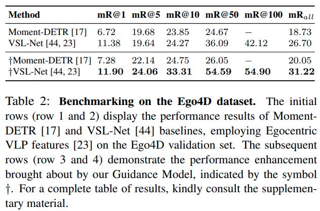 다음은 Ego4D에서의 실험 결과입니다. Ego4D는 MAD에 비해 오디오 정보가 부족한 특징이 있는데, 정확한 비교를 위해 Guidance Model에도 visual과 text feature만 활용했다고 합니다. 이번에도 역시 Guidance Model을 적용하자 성능이 향상되는 결과를 얻었습니다. 다만 영상 길이가 MAD만큼 길지는 않아서인지, 향상폭이 MAD에서처럼 크지는 않네요.