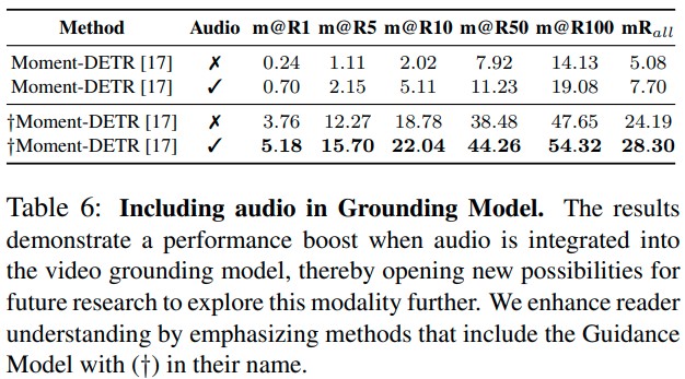 Enhancing Video Grounding by Using Audio. 저자들은 Moment-DETR에 오디오 feature를 함께 활용하여 큰 성능 향상을 얻을 수 있었습니다. 오디오 feature를 활용하는 것이 저자들의 주된 목적이 아닌 만큼, 표1과 2에서는 오디오 feature를 사용하지 않은 성능을 보고하였으나, 이러한 발견이 추후 연구에 도움이 될 수 있는 만큼 한 문단 정리하였다고 하네요.