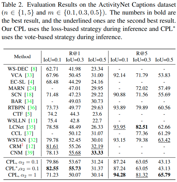 그냥 CPL은 loss 기반 방식, CPL*은 vote기반 방식입니다. Charades에서는 두 방법이 비슷한 성능을 보인 반면, ANET에서는 vote 기반이 확실히 좋은 성능을 보여주었네요. $\alpha_2$는 positive proposal의 다양성을 조절할 수 있는 하이퍼파라미터인데요. 상황에 따라, 쿼리가 여러 이벤트 간의 복잡한 관계를 담고 있으면 오히려 다양성이 낮은 것이 나을 수도 있어, 이에 대한 유연성을 조절할 수 있다고 합니다.