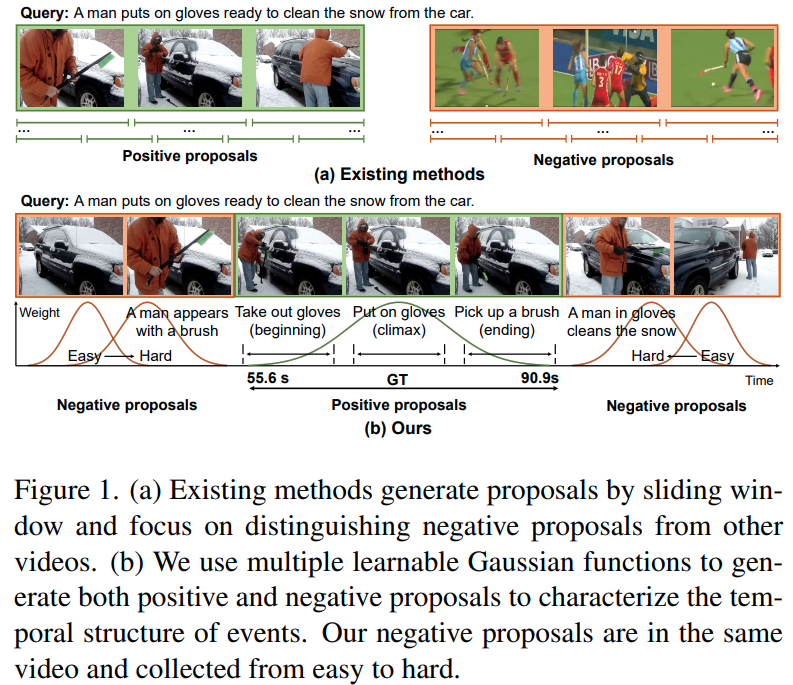 - 기존 방법들은 대부분 sliding window 방식을 통해 proposal을 생성하였는데, 이때 proposal의 생성에 영상이나 쿼리의 내용, 난이도 등은 전혀 고려하지 않기 때문에 proposal의 품질이 낮고 비효율적이었다고 합니다. CNM은 학습가능한 하나의 가우시안 마스크를 통해 positive proposal을 생성하는 방식으로 이를 극복하고자 하였지만, 편집되지 않은 긴 영상 속에는 대부분 하나 이상의 유사한 장면들이 등장하여, sub-optimal solution에 빠질 가능성이 높았습니다.