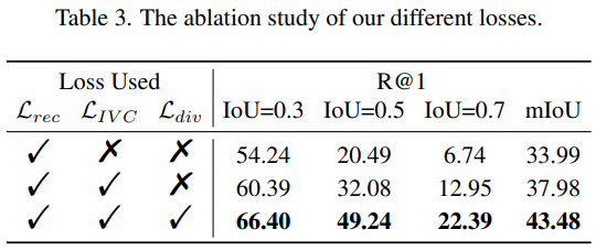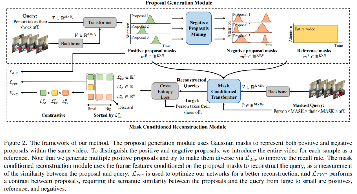 Mask conditioned reconstruction 모듈에서는 각 proposal을 이용해 original query를 복원하게 됩니다. 이때, 쿼리와 align이 높은 proposal일수록 쿼리를 더 잘 복원할 수 있으리라는 가정을 통해, 모델이 생성한 positive proposal이 쿼리를 잘 복원하도록 학습을 진행합니다. Reconstruction loss $\mathcal L_{rec}$은 positive proposal과 reference 간의 교차 엔트로피 손실로 구성됩니다. 마지막으로 intra-video contrastive loss $\mathcal L_{IVC}$를 제안하는데요, 이는 positive proposal을 통한 쿼리 복원 결과가 negative proposal에 의한 복원이나 전체 영상에 의한 복원 결과보다 좋아지도록 합니다.