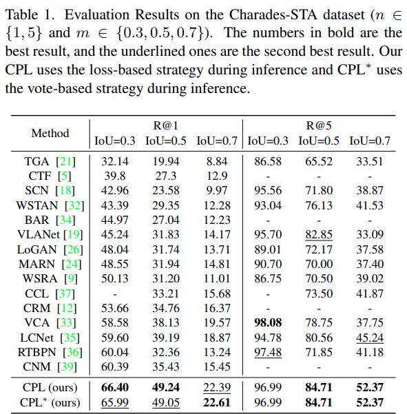 특히 이 논문 이전의 weakly-supervised 연구들은 sliding window 방식으로 proposal을 생성하고 positive visual-language pair와 negative pair를 구분하도록 학습시키는 방식을 많이 사용하였는데, 이 경우 negative pair는 다른 영상에서 랜덤 하게 선정되므로 정작 같은 영상 내에서 찾고자 하는 구간을 잘 찾도록 학습하기에는 적절하지 않았다고 합니다. 본 논문에서는 이러한 단점을 극복한 Contrastive Proposal Learning (CPL)을 제안합니다.
