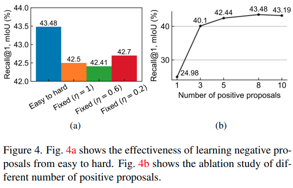 한편, negative proposal의 난이도를 $\eta$를 통해 조절해 주는 방식도 성능 향상을 불러오는 모습을 그림 4에서 볼 수 있습니다. negative proposal이 항상 positive로부터 먼 경우 ($\eta=0.2$)보다 가까운 경우($\eta=1$) 성능이 낮은 것을 볼 수 있는데, 이는 positive proposal의 정확도가 낮은 학습 초반부터 hard negative가 들어간 결과로 보인다고 합니다.