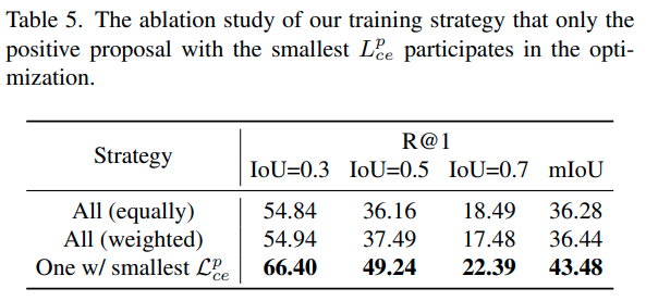표 5에서 $K$개의 positive proposal 중 일부만 사용하는 학습 전략이 유효함을 확인할 수 있는데요. 모든 psitive pair를 사용하거나, 순위에 따른 가중치를 부여해 사용하는 것보다도, 가장 loss가 작은 것만 사용하는 게 성능이 10 이상 좋았습니다.
