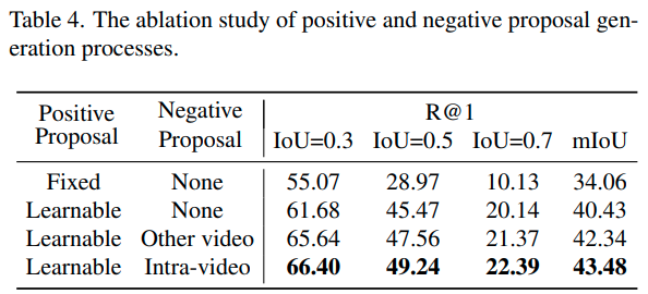 Effectiveness of Proposal Generation. 저자들이 여러 번 강조한 것처럼, positive proposal 생성을 학습 가능한 방식으로 바꾸기만 해도 성능이 크게 올라갔습니다. 이어서 negative proposal도 활용하는 편이 확실히 성능이 올랐는데, 이때 같은 영상에서 생성해 주는 편이 성능을 확실히 올려주는 모습이네요.