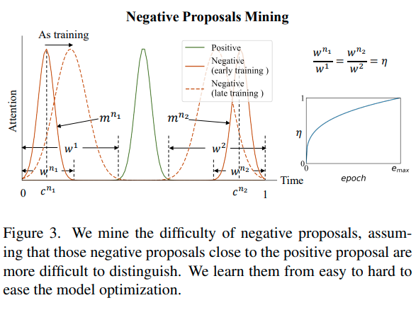 Negative Proposal Mining. 그림 3에 나타난 것처럼, 저자들은 positive proposal의 전후로 두 개의 negative proposal을 생성하고, 각 negative proposal의 끝이 영상의 맨 처음과 끝에 해당하도록 하였습니다. 이어서, negative proposal과 positive proposal의 거리 $\eta$를 negative proposal의 너비 $w^{n_1}, w^{n_2}$와 positive proposal의 너비 $w^1, w^2$의 비율을 통해 아래와 같이 정의하였습니다.