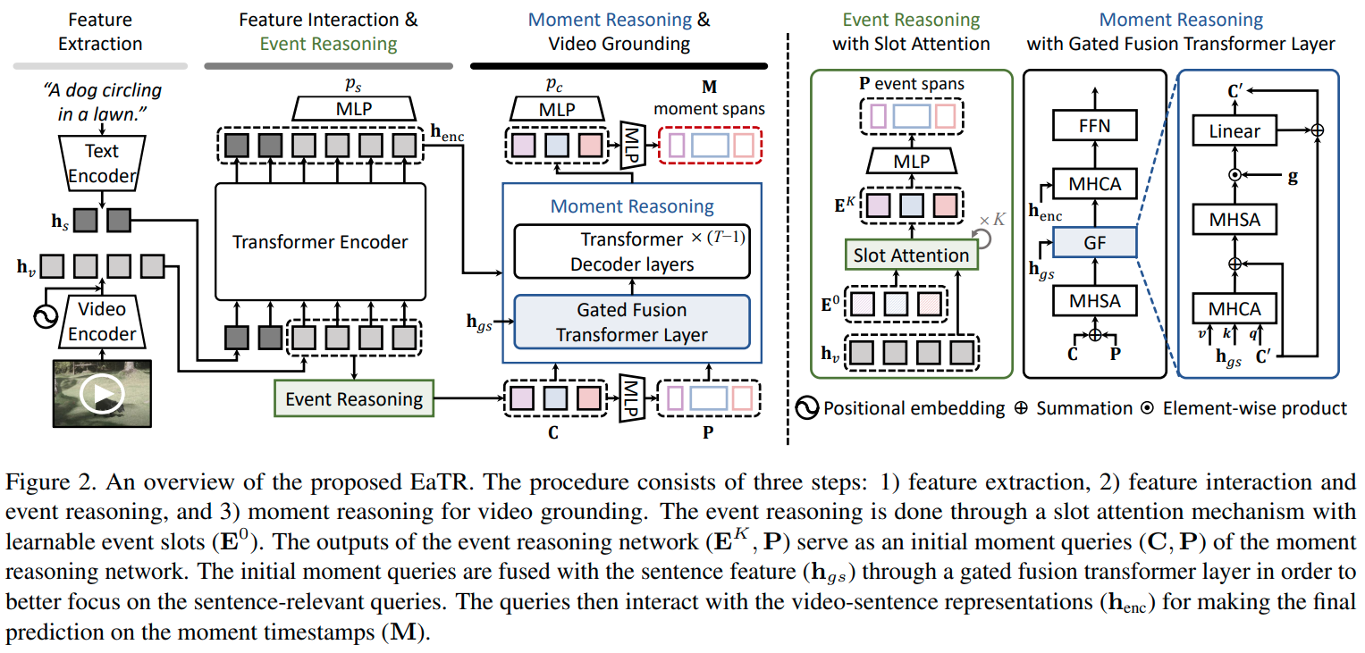 본 논문에서는 영상을 event unit들의 집합으로 정의하고 이들을 dynamic moment query로 처리하는 Event-aware Video Grounding TRansformer, EaTR을 제안합니다. EaTR은 두 가지 level에서의 reasoning을 수행하는데, 1) 영상 속 event unit을 찾고 content and positional queries를 생성하는 event reasoning과 2) moment query들을 입력된 문장과 fuse하고 timestamp를 예측하는 moment reasoning입니다. 먼저, 랜덤하게 초기화된 학습가능한 event slot들이 slot attention을 통해 영상 속에서 event unit들을 찾아냅니다. 찾아진 event unit들을 moment query로 이용하여 input-specific referential search area로 활용되어(그림 1c) 영상과 문장 간 interaction을 포착하고 moment timestamp를 예측하게 됩니다. 이때, gated fusion transformer layer를 통해 쿼리와 무관한 moment query들의 영향을 효과적으로 최소화하고 가장 informative 한 referential search area를 포착하게 됩니다. Gated fusion transformer에서는 moment query와 sentence representation이 유사도에 따라 병합되며, 이렇게 얻어진 video-sentence representation을 트랜스포머 디코더에 입력하여 최종 video grounding 결과를 예측합니다. 복잡하네요.