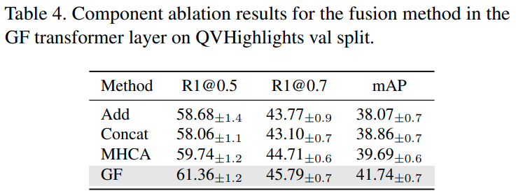 Fusion method in the GF layer. GF 계층에서의 fusion 방식을 비교한 실험입니다. Add와 Concat은 성능이 형편없고, 적어도 MHCA와 같은 계층을 사용해 줘야 문장과 유관한 쿼리와 그렇지 않은 쿼리를 잘 구분할 수 있는 것 같습니다.