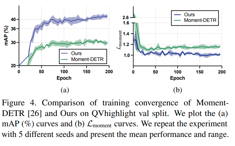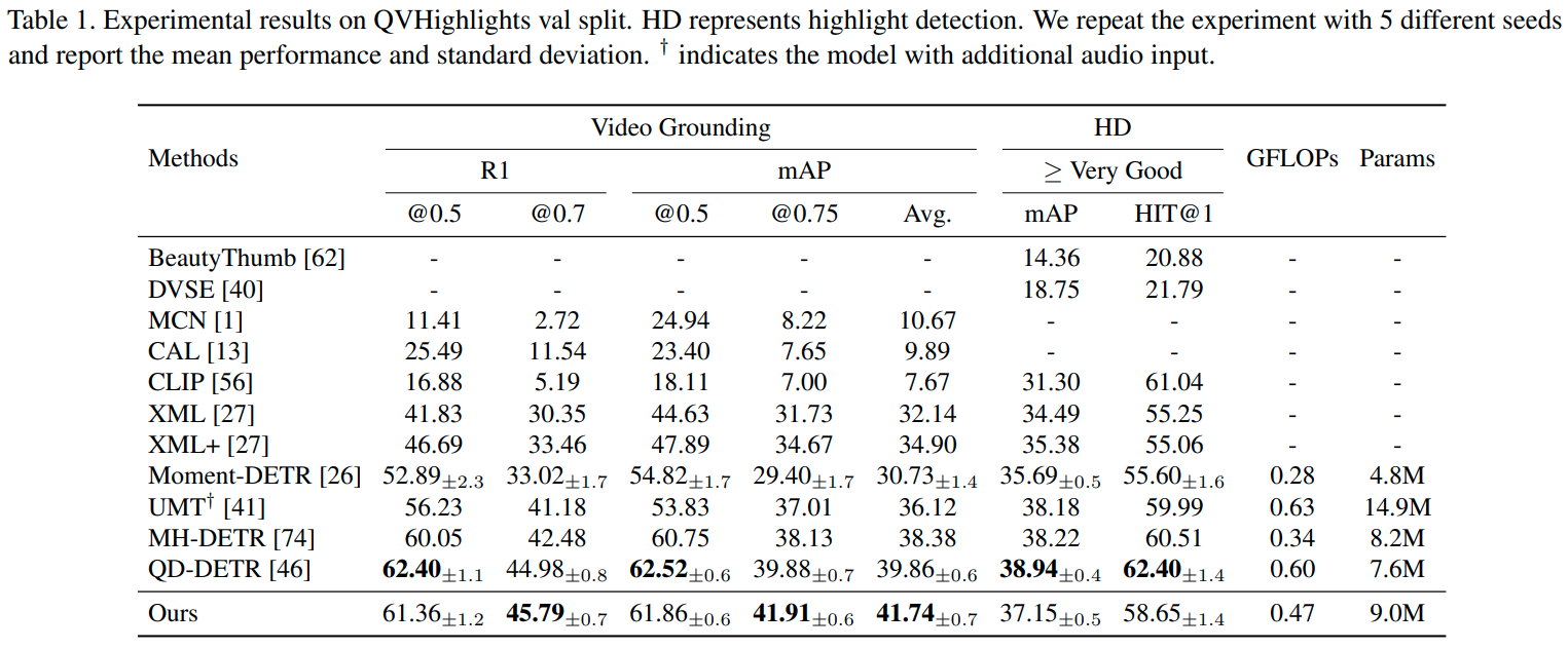 Training settings. 트랜스포머 인코더와 디코더의 개수는 $T=3$으로 하였고, 밸런싱 파라미터는 $\lambda_{l_1}=10, \lambda_\text{iou}=1, \lambda_c=4, \alpha=0.2$를 적용했고, $\lambda_\text{sal}$의 경우 QVHighlishgts는 1, Charades와 ANET은 4를 썼습니다. Hidden dimension은 256, 어텐션 헤드는 8을 썼고, 학습은 배치 사이즈 32에서 AdamW로 200 에포크 진행했습니다. weight decay는 1e-4를 썼고 초기 learning rate는 QVHighlights는 1e-4, Charades와 ANET은 2e-4를 썼습니다. 실험은 파이토치 1.12.1과 한 장의 A6000에서 진행했는데, 복원해 보니까 복원이 안되더라고요 하하... 그래도 저자들이 여러 시드에서 실험을 진행하는 등 투명성을 위한 노력은 보여준 것 같은데, 조금 아쉽습니다.