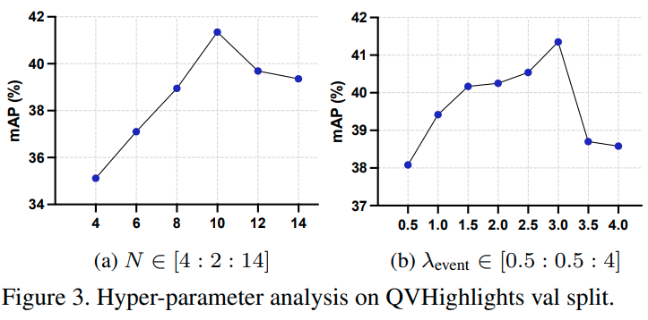 Number of moment queries. Moment query의 수 $N$에 대한 비교 실험입니다. Moment query의 수가 곧 referential search area의 granularity와 연관되어 있으므로, $N$이 증가할수록 성능이 증가하지만 너무 커지면 모델이 긴 이벤트를 찾기 어려워지는 문제가 발생하며 성능이 감속합니다. 10에서 가장 좋은 모습을 보였습니다.