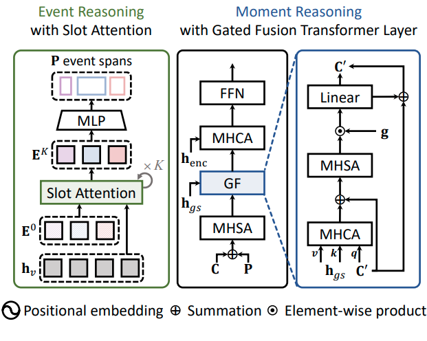 일반적인 slot attention과 달리, 저자들은 GRU 계층을 residual summation 연산으로 바꾸어 연산 효율을 올렸다고 합니다. event slot $\mathbf e^K_n\in\mathbf E^K$가 영상 속 각 event에 해당하는 시각적 정보를 가지고 있기 때문에, $\mathbf E^K$를 content query $\mathbf C$의 초기값으로 활용합니다. 추가로, $\mathbf E^K$를 2차원 임베딩 공간으로 투영하여 referential search area의 중심과 길이를 나타내는 초기 positional query $\mathbf P$를 유도합니다.