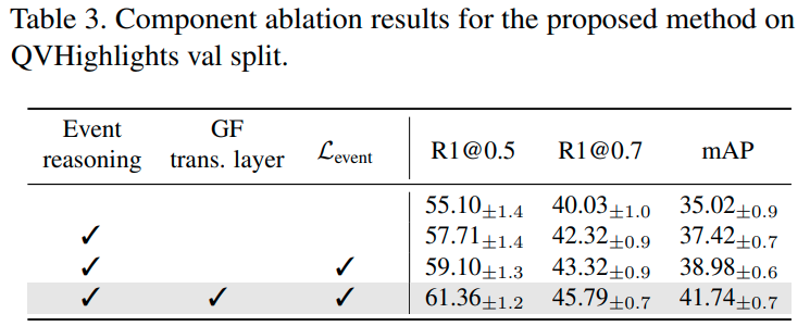 Compoment ablation. 빠지면 섭섭한 제안된 요소별 ablation입니다. Event reasoning, GF 트랜스포머 계층, event localization loss 모두 성능을 향상하는 모습입니다.