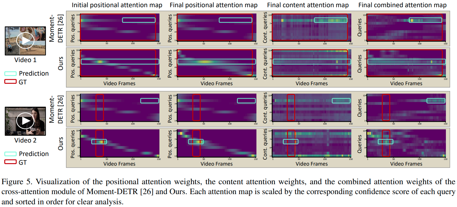 Attention visualization. 저자들은 initial positional query와 frame positional embedding (첫 줄), final positional query와 frame positional embedding (둘째 줄), final content query와 video-sentence representation (셋째 줄), 전체 moment query와 video-sentence representations with frame positional embedding (마지막줄) 간의 어텐션을 시각화하였습니다. 각 어텐션 맵에서 수평 축과 수직 축은 각각 frame과 query를 나타냅니다. Moment-DETR의 init. positional query들은 고정된 input-agnostic search area를 가지고 있어 서로 다른 두 영상에서도 유사한 어텐션을 보이고 있습니다. 한편, EaTR의 어텐션은 입력 영상에 따라 달라지는 모습을 확인할 수 있습니다.