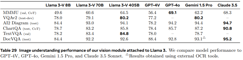 405B 모델의 경우 타사의 플래그십 모델인 GPT-4o, Gemini 1.5 Pro, Claude 3.5와 비슷한 성능을 보이며, 70B 모델이 GPT-4V를 완전히 앞선 것이 인상적입니다.