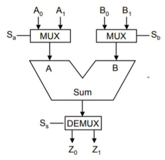예를들어, 위 이미지에서 우리가 $A_0$와 $B_0$의 합을 구하고, 이 값을 $Z_0$에 저장하고 싶다면, 각 MUX와 DEMUX가 우리가 원하는 값을 Adder에 전달하도록 $S$ 신호를 보낼 수 있다.