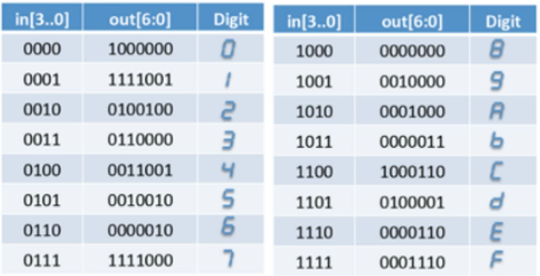 입력이 4-bit hex이며 각 값에 대해, out을 7-bit binary의 대응하는 값으로 매핑해준다.