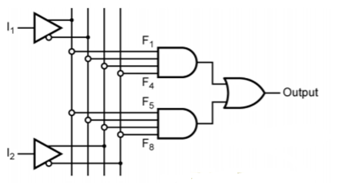 AND 배열과 OR 배열의 구조를 갖는데, AND 배열을 통해 논리곱을 구할 수 있고, OR배열로 이들의 논리합을 구할 수 있다. 이 때문에 PLA는 SOP를 구현하는데 이상적인 구조이다.