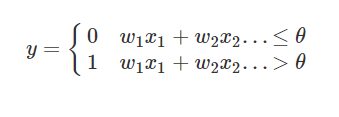 한 개의 퍼셉트론은 n개의 입력(x)을 받는다. 이 입력들은 각 입력에 대응되는 가중치(weight)를 곱한 후, 모두 합쳐진다. 이때 입력값에 가중치를 곱한 값들의 합이 임의의 임계값(Threshold) Θ보다 크다면 퍼셉트론은 1(True라고 해석해도 좋다.), 아니라면 0을 출력하는 것이다.