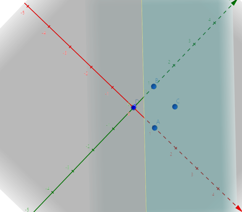 그래프 g 위에서, 점 D(0,0,-0.5)만이 결괏값(z)이 0 이하이고, OR 연산의 조건에 충족되는 A(1,0,0.5), B(0,1,0.5), C(1,1,1.5) 세 점은 모두 양의 결괏값을 가지고 있다.