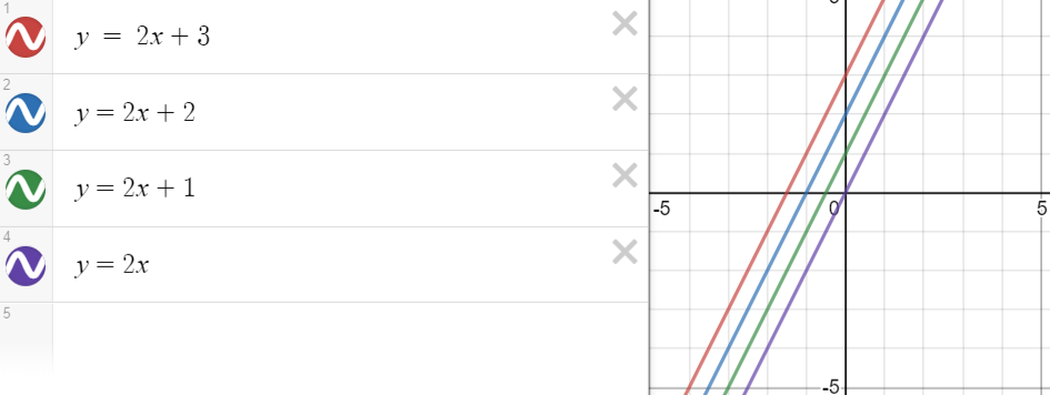 2x 뒤의 어떤 수 b를 0~3으로 바꿔주니 직선이 조금씩 움직였지만, 모든 그래프는 같은 기울기의 직선을 형성했다. 이를 통해 우리는 선형 함수에 어떤 수를 더해줌으로써 그래프를 이동시킬 수 있다는 것을 알 수 있다.