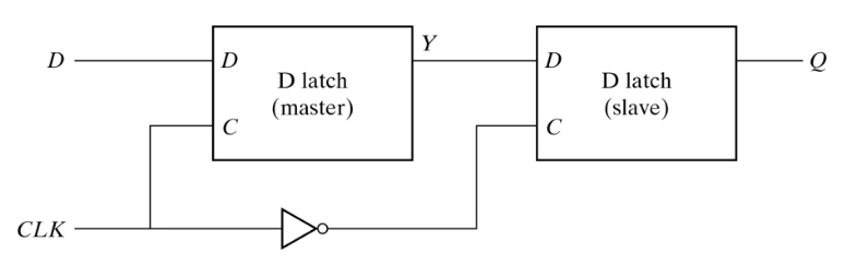 위 경우, CLK가 각 D latch에 다르게 들어가기 때문에, 최종 결과는 falling edge에서 변화하게 된다. 두 Latch를 이용하여 Flip Flop을 구현한 것이다.
