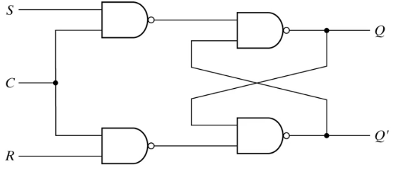 S-R latch는 교차 연결된 NOR 게이트들로 구성된다. R은 reset, S는 set 신호를 의미한다.