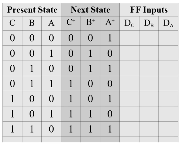 - 각 플립플롭의 입력 식을 유도한다.